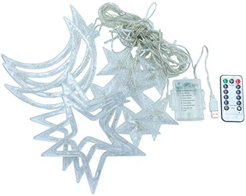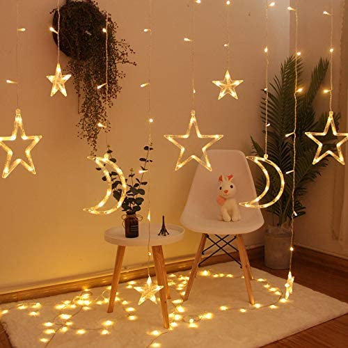 High Brightness: 138 LED Warm White Moon Star Curtain lights, widespread lighting source, create romantic life for you.Widely use: Star Moon Curtain lights can be hung on walls, windows, doors, floors, ceilings, grasses, Christmas trees etc.Waterproof: The Moon Star Curtain lights LED is waterproof and designed to withstand light rain or water spills, perfect for outdoor & indoor decoration.