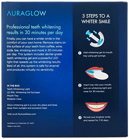AuraGlow Teeth Whitening Kit, LED Light, 35% Carbamide Peroxide, (2) 5ml Gel Syringes, Tray and Case