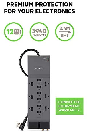 Belkin Power Strip Surge Protector – 12 AC Multiple Outlets & 8 ft Long Flat Plug Heavy Duty Extension Cord for Home, Office, Travel, Computer Desktop, Laptop & Phone Charging Brick (3,940 Joules)