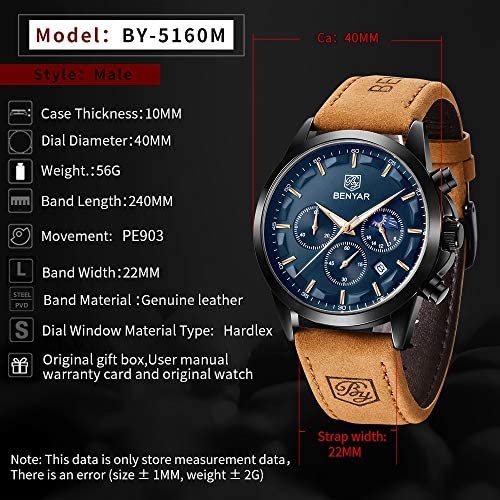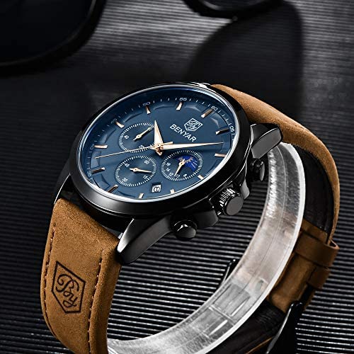 BENYAR brown leather strap wrist watch for men is water-resistant up to 30M and can bear sweat, accidental rain or water splash. This watch is round and is scratch-resistant and provides a smooth feel. The durable Leather band is flexible and keeps your wrist ventilated.
