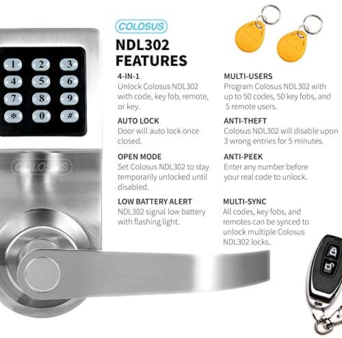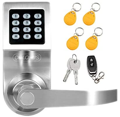 Colosus electronic keyless keypad door lock completes your security system. Say goodbye to door lock keys and hello to keyless entry with digital door technology from Colosus. Create custom pin pad access codes for up to 50 passcode users, set up key fobs (RFID) for up to 50 users, and even assign remote controls for up to 5 users. Different access methods for everyone in your home, office, or business.