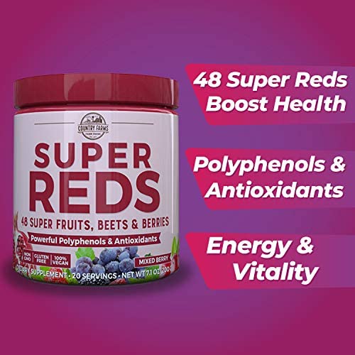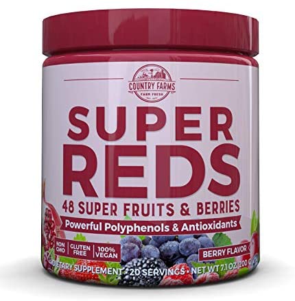 According to the Centers for Disease Control, only 1 in 10 Americans consume the fruits and vegetables they need on a daily basis. Now you can obtain the many benefits of eating healthy with Country Farms Super Reds superfood powder. Super Reds is an energizing polyphenol superfood blend that helps the body maintain energy levels and stability, while promoting heart, circulatory and brain health. Polyphenols are powerful antioxidants providing numerous health benefits by helping to reduce cell damage. Country Farms Super Reds is a powerful superfood blend containing 48 different foods and berries that are rich in antioxidants, phytonutrients and fibers. Country Farms are convenient, easy-to-use supplements that help restore daily consumption of essential fruits, vegetables, greens, sprouts, seeds and superfoods that Mother Nature intended us to enjoy.