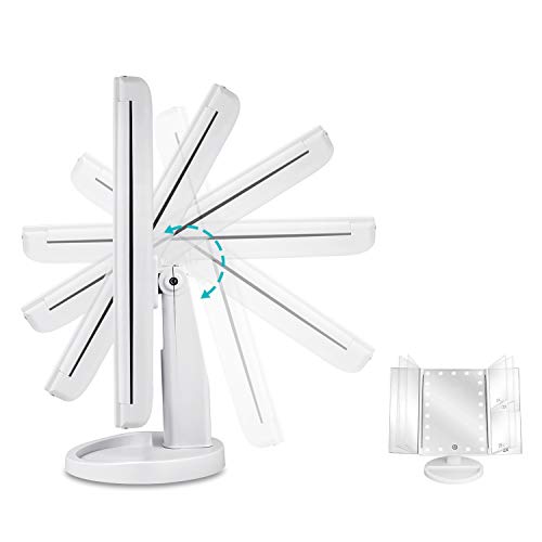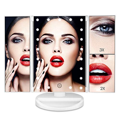 deweisn Tri-Fold Lighted Vanity Mirror with 21 LED Lights, Touch Screen and 3X/2X/1X Magnification Mirror, Two Power Supply Mode Tabletop Makeup Mirror,Travel Mirror