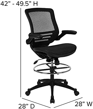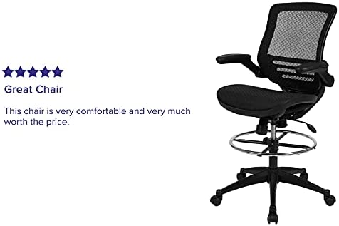 When you spend more time at your desk than anywhere else it’s time to invest in a top-notch chair. This high quality drafting chair is constructed with a higher seat range to reach work surfaces that are above the average desk height, like counters and bars. Designed for artists, engineers, lab technicians and other creative work professionals, this tall drafting chair provides enhanced back support to maximize productivity. Featuring breathable mesh material and extra padding throughout, this drafting stool will help keep you cool and comfortable during extended work sessions. Our adjustable-height drafting chair effortlessly raises and lowers to your desired height via an easy-to-operate pneumatic adjustment lever while the integrated chrome foot ring around the base provides a comfortable place for your feet to rest. The waterfall front seat edge helps reduce pressure on the lower legs while increasing circulation. Padded armrests flip up and out of the way as needed, allowing you to quickly switch between tasks with greater flexibility. If you work at a non-traditional surface height, a comfortable chair is a must have so the multiple adjustment features in this office drafting chair will be a welcome addition. Synchro-tilt control lets the chair’s seat and back recline at different rates, increasing the angle between your torso and thighs for an ideal sitting position and the contoured back with lumbar support may help to alleviate strain on your spine and back muscles. 360 degree swivel paired with dual-wheel, easy-rolling casters allows you effortless mobility to maximize your workspace. Spills clean up easily with a solvent based cleaner, no water required. Whether you go to the office or work from home, this mid-back mesh chair offers a practical and attractive seating solution to get you comfortably through your workday.
