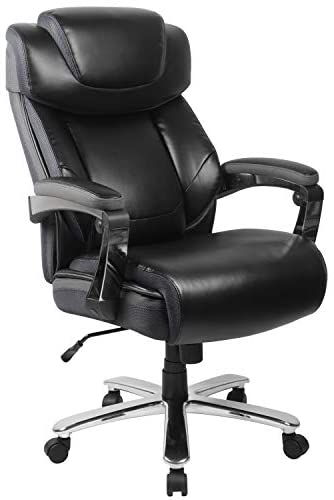 If your job or hobby requires you to sit for long stretches of time having the right chair is priceless. The thick, plush padding, black LeatherSoft upholstery and adjustable headrest featured in this Big & Tall executive swivel office chair are a must have. Big & Tall office chairs are designed to accommodate larger and taller body types. This chair has been tested to hold a capacity of up to 500 lbs., offering a broader seat and back width. High back office chairs have backs extending to the upper back for greater support. The high back design relieves tension in the lower back, preventing long term strain. The included headrest will take the pressure off of your neck while leaning back. The tilt lock mechanism offers a comfortable rocking/reclining motion. The free rein motion is great for taking a quick break from typing to answer phone calls and relax. The waterfall front seat edge removes pressure from the lower legs and improves circulation. Chair easily swivels 360 degrees to get the maximum use of your workspace without strain. The pneumatic adjustment lever will allow you to easily adjust the seat to your desired height. The chrome base adds a stylish look to complement a contemporary office space.
