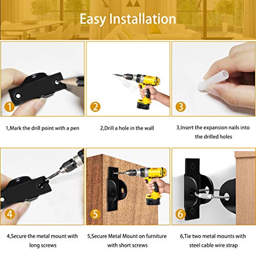 【400 Pounds Endurance Metal Furniture Anchors Anti Tip】Total 6 sets of metal furniture wall anchors made of top quality metal material with 400 pounds endurance. Metal furniture anchors are more trustworthy than plastic and less likely to rip off. Furniture straps for baby proofing used for anchoring bookshelf, dresser, TV stand and other furniture.