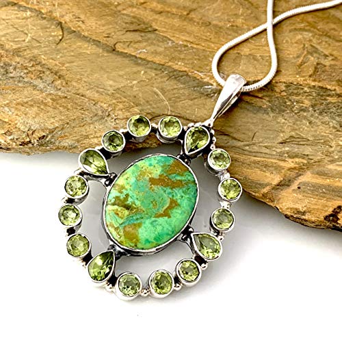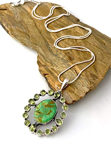 Natural green turquoise surrounded by a constelation of 16 genuine peridot (~4 – 6mm each). A superb high quality handmade pendant. Since recent times, the demand for green turquoise has increased. Several green turquoise varieties that are now considered to be some of the top ranked turquoise, include the Nevada’s turquoise. The most famous green turquoise comes from Tonopah Blue Gem mine in Nevada. The Tonopah Blue Gem mine is famed for lime green turquoise with a typical light caramel-brown matrix. Arizona has one of the longest histories of Turquoise production in the United States. ~ This jewelry will be carefully gift-wrapped in a satin pouch bag or Ameogem paper gift box (please choose). A purchase option of a luxury gift box is available for a special gift. ~ Turquoise is the birthstone for the month of December, and a perfect gift for the 6th and 11 anniversary.