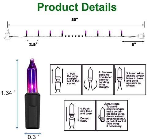 Incandescent Halloween Mini Lights: Decorate with Twinkle Star 150 counts purple incandescent mini lights will give a scary and spooky festive feel to your Halloween. These beautiful string lights bulb space 2.5 inch, 2.5V and 0.42W per bulbs, built-in 3A fuse for safe use.
