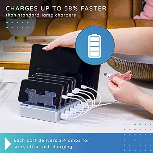 Fast and smart charge, the 6 port fast charging dock will charge your devices up to 58% faster than other devices offering 2.0 amps or less; the stand recognize your devices and deliver the amp needed