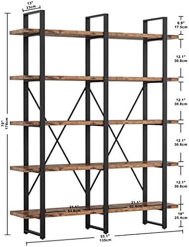 Double Wide 5-TIER large open shelves — Bookcase Dimensions 53.1″L x 13″Wx70″ H. Board thick: 1.1″. Clearance between Shelves: 12.1″. Load Capacity of Each shelf: 135 lbs.