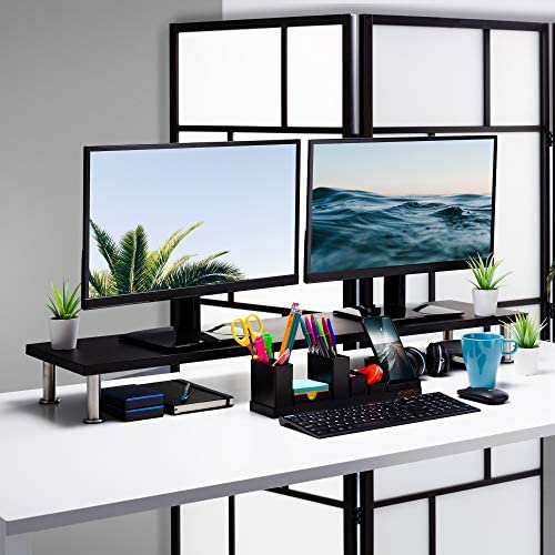 Large Dual Monitor Stand for Computer Screens – Solid Bamboo Riser Support The Heaviest Monitors, Printers, Laptops or TVs – Perfect Shelf Organizer for Office Desk Accessories & TV Stands (Black)