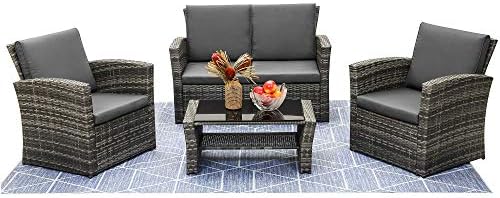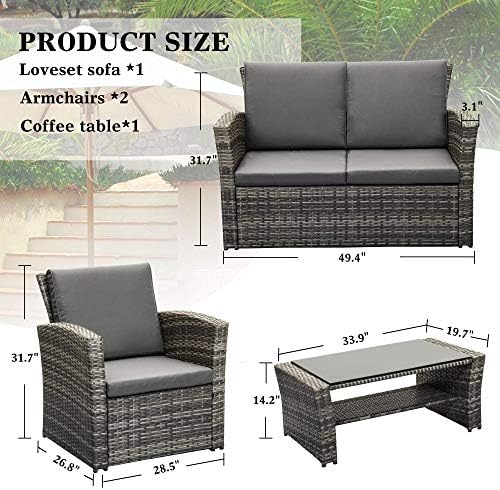 4 PIECE SET INCLUDES: LayinSun outdoor furniture sets come with 1x loveseat, 2xArmchairs, 1x coffee table, and 8 x cushions. This easily accommodates a family of four in the living room or on the patio.