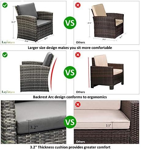 STURDY AND DURABLE: LayinSun patio furniture made of high-quality PE rattan wicker and metal frame, rustproof and sturdy enough to withstand weather variations, ensure your sofa set for years to come. With soft cushions, take you optimal comfort and relaxation.