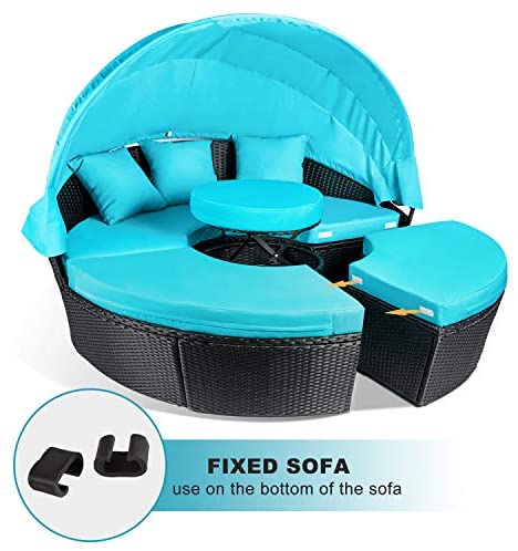 M&W Patio Furniture Outdoor Daybed with Retractable Canopy and Soft Cushions, PE Wicker Rattan Round Sectional Sofa Set for Lawn Garden Backyard Poolside, Turquoise