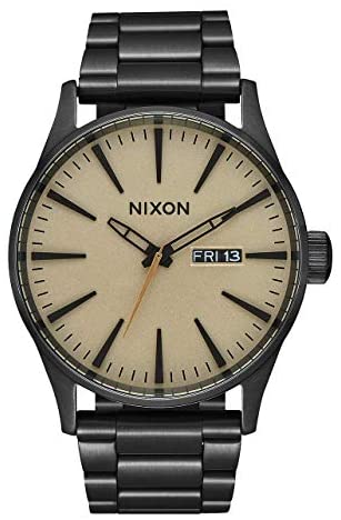 Sentry Ss. A classic Nixon design, the black and rose gold Sentry SS is modern and multi-faceted with 3-hand movement, day/date window, and a tapered custom 3-link stainless steel bracelet.