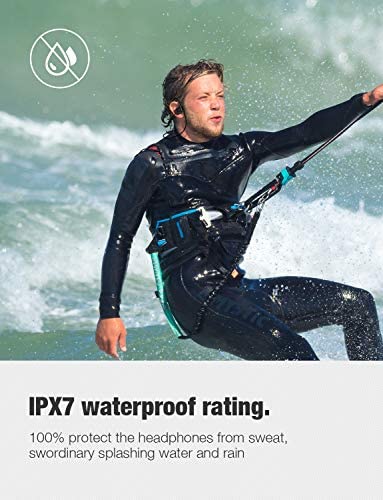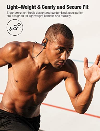 IPX-7 Waterproof Rating.With ergonomic design and silicone ear hooks, wireless headphones secure stay on your ears, feel great to wear and will never fall out. Upgraded Waterproof Rating, 100% prevents ordinary splashing water and rain.