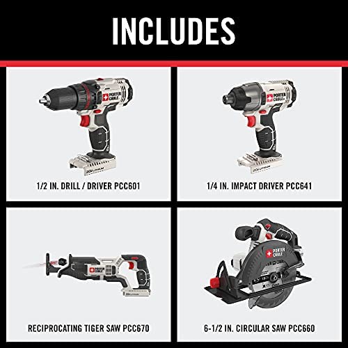 The cordless tools combo kit includes 1/2-inch Drill/Driver, 1/4-inch Impact Driver, 6 1/2-inch Circular Saw, Reciprocating Saw, Jig Saw, Osciallating tool, Cutoff tool/grinder, LED flashlight, two batteries, charger, and kit bag.