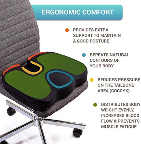 Best Seat Cushion – If you spend +8 hours a day in a seated position, this comfortable pad is just right for you. It provides additional support you need to maintain good posture and the natural curve of the spine. By evenly distributing weight of the body, it offloading pressure on the spinal discs. The ergonomic design helps to increase blood flow, prevents pain in the lower back, helps with muscle fatigue, leg tightness, hamstring. It allows you to sit upright naturally without pain
