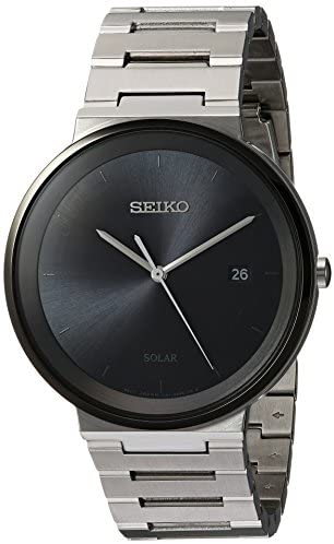 Seiko Men’s Essentials – Contemporary. This modern men’s watch is designed with a stainless steel case and bracelet featuring a sleek black dial with sunray finish and date calendar. Powered by any light energy, its Solar Cell is energy-efficient with a 10-month power reserve once fully charged. No battery change is required. 30M (3bar) Water Resistant