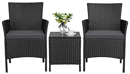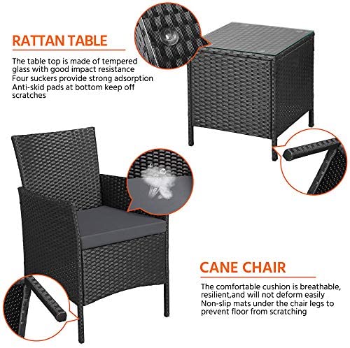 YAHEETECH 3 Pieces Patio Porch Furniture Sets Outdoor Garden Furniture Sets PE Rattan Wicker Chairs with Washable Cushion & Tempered Glass Tabletop Grey Cushion