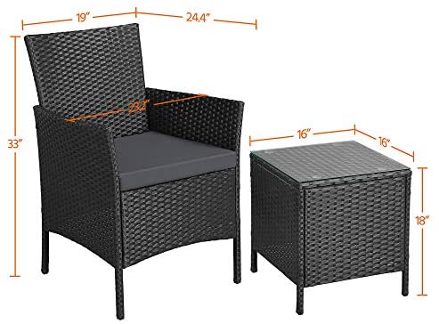 Durable metal & rattan materials: The tea chairs & table set is mainly made from steel, PE rattan, and tempered glass. The whole frame is steel and all-around covered by PE rattan. The tabletop comes with tempered glass and each chair comes with a soft cushion.